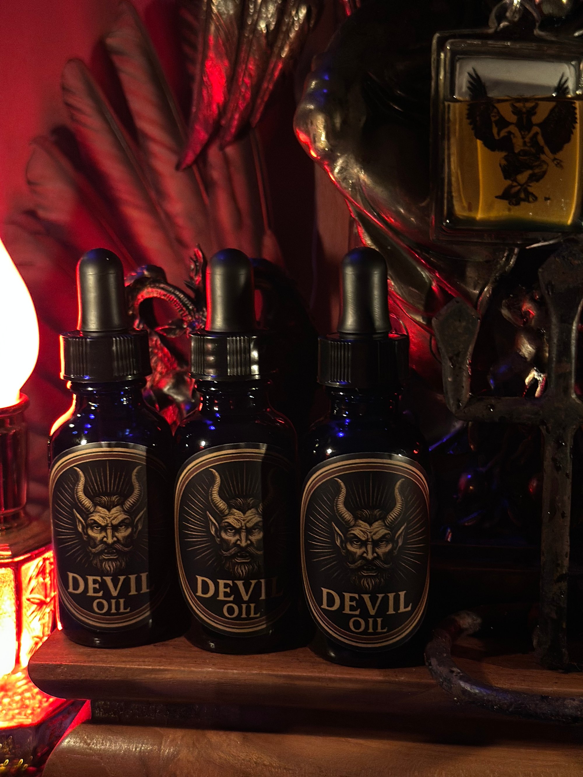 First crafted three years ago in the Den, this oil was born to bridge every mask of the Dark One — from the European Devil of witch-craft and command, to the Southern spirits of dominion, and the Dark Angel of Thailand whose flame crowns both temptation and transcendence.