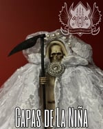 A handmade devotional dress crafted for a traditional Mexican-style statue of Santísima Muerte, one foot tall — the style where La Niña holds the world in one hand and the scythe in the other.